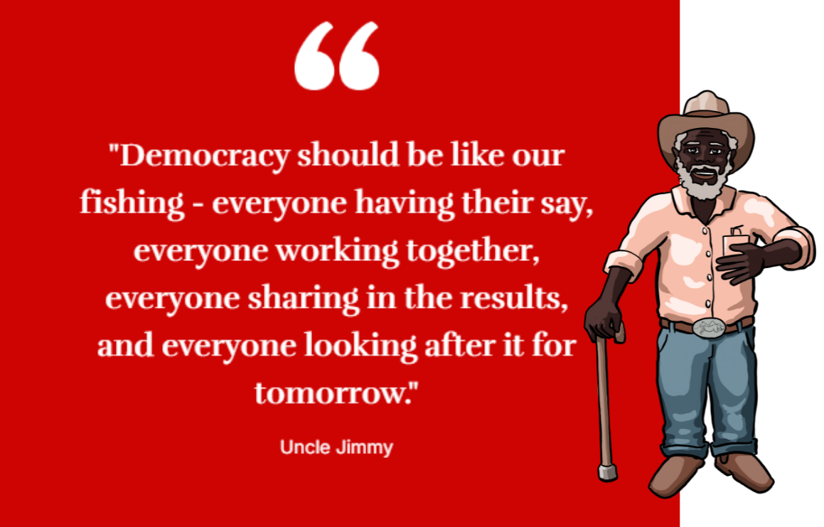 Uncle Jimmy always says the best learning comes through stories about things we know. That’s why in this guide, we talk about politics and democracy through fishing – something our mob has done forever on Country.